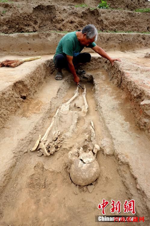 图为考古工作人员在清理出土的尸骨遗骸