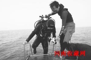 “准备下水!”14时37分随着梁国庆大声招呼,穿好潜水服背好氧气瓶的两人走到船舷,此时船上其他队员有的帮他们整理设备,有的记录下潜队员姓名、潜水方式、氧气瓶的气压、下水时间等各种数据。随后两人一前一后跳入水中在沉船浮标处会合,就见他们相视一眼同时做出OK的手势后潜入水中。梁国庆说,水下考古面临各种危险,像沉船附近一般挂住的渔网、绳索较多,队员在发掘古沉船的工作过程中被渔网罩住不能动弹、绳索挂住氧气瓶等各种危急情况时有发生,“上个月我们在天津一带海域工作时,有个队员就被渔网挂住了,幸好及时解脱了。”相隔十分钟后,另外两人一组考古队员也潜入海中。