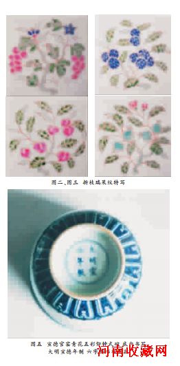 4.民间确实存有宣德五彩和青花五彩瓷,我们这次发现的这件宣德官窑青花五彩(描金)仰钟式碗,尽管还是一个孤例,但是,可以断言民间的确保存宣德官窑五彩和宣德官窑青花五彩瓷器。这是毋庸置疑的,也是我们完全可以确信的。只要我们有耐心,多向民间广大收藏家求教,多与民间收藏家联系、沟通和交流,宣德官窑青花五彩瓷,是不难发现的,也不难找到的。据一般分析,社会王朝宫廷使用的御用器,宣德时期宫廷使用的青花五彩瓷等类瓷器物件,散落或流传在民间的途径和渠道还是有的。宣德时期在朝官员的贪渎使御用官样五彩瓷流入民间;宣德皇帝以赏赐形式或赏赐外国朝贡使节和王朝在位的大臣而流入社会的御用瓷器;再如封建王朝官样瓷器进入市场售卖也同样能流入民间等等情况。这些都是事实,也是情理之中的事。我们相信,随着科学考古工作的开展,基本建设工程的实施和文物保护工作的深入人心,人民群众觉悟的不断提高,各种文物包括宣德时期的各类官用瓷器,特别是宣德官窑五彩和宣德官窑青花五彩瓷器,一定还会被发现,这是完全可以预料到的,只不过是数量的多少而已。