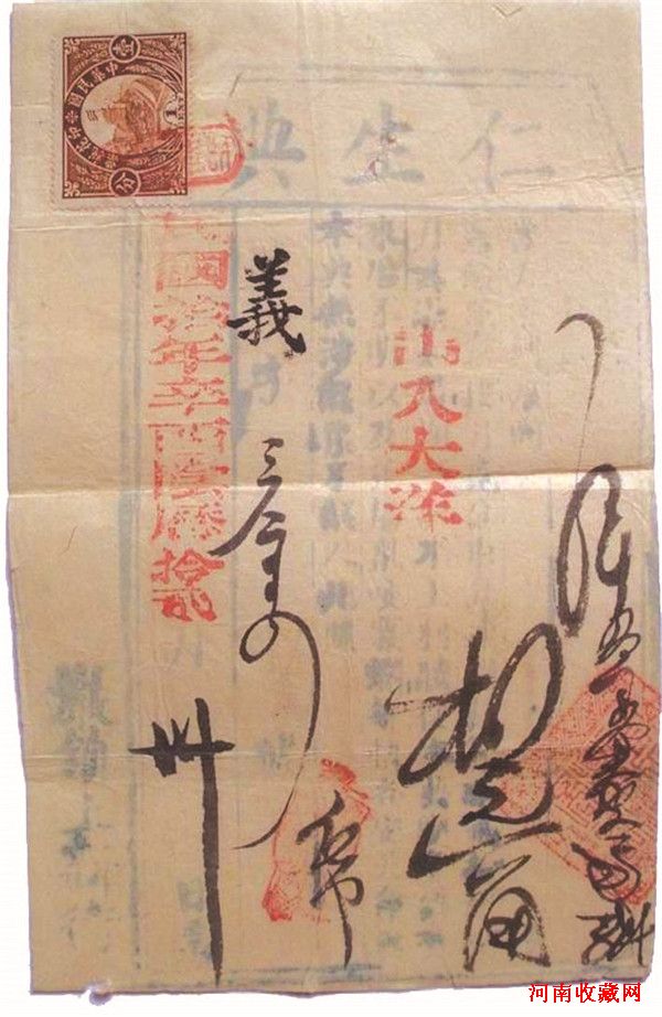 当票上除有固定的印刷内容外,还有手写的文字,如有关当物名称、质量、数量、典当金额等内容多为手书,字体采用本行业专用文字。这些文字比草书还草,字体别具一格,外行人(就连一些书法家)也很难辨识,故俗语有“当店字有头无耳”之说。古代当票实物存世不多。笔者曾经在桂林古玩市场地摊上购得一张民国时期的当票(见图)。该当票纸质为黄色纯棉纸,长195毫米,宽138毫米,刻版印刷,图案为标准契券格式,分天头和地格两部分。天头内书当铺名“仁生典”、地格内文字内容从左至右分别为:“执帖人××今因急用将己物当现银币大洋为壹拾元。奉今出入均用现银币,每月叁分行×,期限拾捌個月为满,过期任铺变卖,原有鼠咬虫蛀物主自甘,此帖为照。”这张当票上的当物名称、数量、质量、典当金额及年月日文字都为手书,字体潦草,有些内容不可卒读。当票上当的究竟是什么物件,还有待行家识认。