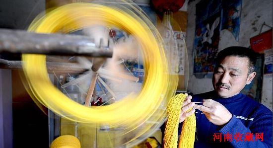 11月11日,河南省商丘市夏邑县火店镇班庄村的一名村民在纺排须用线。