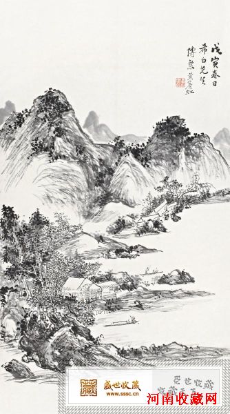 此作是黄宾虹画中常见的“左山右水”式构图:近景汤汤的江水中,石岛纠结而起,上生杂树。常年的江风吹袭,令树木略呈左倾,并将山势导向左侧江岸。江岸之上,林木秀茂,一处茅舍坐落其间。沿着逶迤的江岸,画面推移至中景:平淡的山峦,连绵起伏,各向左右,延伸出画面。右侧山麓下的两三林屋,沿江而筑,其斜势,亦将空间推向画外。远山以湿笔淡墨,大笔拖写。山峦环抱的大片江面,只在岸边勾勒数笔水纹,平平的江水,则以留白法示意而出。两叶扁舟,悠然江上,愈发增添了画面的平和宁静之感。