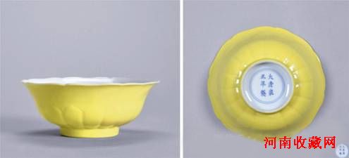 说明:此碗状若盛开之莲花,呈八瓣花口,碗壁下部模印莲瓣,婉转流畅,极富动感,器型比例协调,尽显“曲线之美,别有新意”。外壁施柠檬黄釉,古人亦称其为“洋黄彩”或“珐琅黄”。传世所见柠檬黄釉以雍正朝制品最为精妙。目前北京故宫博物院所藏柠檬黄釉瓷数量稀少,器型多为盘、碗、杯、碟等圆器。清宫《乾隆记事档》载:“乾隆三年元月二十五日,太监高玉交首领萨木哈、催总白世秀……洋黄三寸碟、洋黄里外收小三寸盘……传旨交与烧造瓷器处唐英,照样烧造送来。”此处所说的“洋黄瓷器”当指雍正朝的旧物,说明乾隆初年宫中所存柠檬黄釉已经不多,需要仿烧才解决短缺的问题,由此可推想雍正时期的柠檬黄釉烧造数量十分有限,否则相隔短短数年皇帝无需专门传旨仿造。 雍正御窑中,单色釉以匀净、不事雕琢之美闻名,柠檬黄釉即始创于雍正年间,而早在康熙时期,内务府珐琅作就已使用从西洋引进的锑黄作为珐琅彩瓷器的彩料和色地,由于这种黄釉的颜色比传统浇黄釉更为浅淡幽雅,故又称为“淡黄釉”,清代文献称之为“西洋黄”、“洋黄”,是以氧化锑为主要呈色剂的低温色釉。雍正十三年唐英撰《陶成纪事》记载了“岁例供御”的五十七种彩、釉,其中的“西洋黄色器皿”所指便是柠檬黄釉。