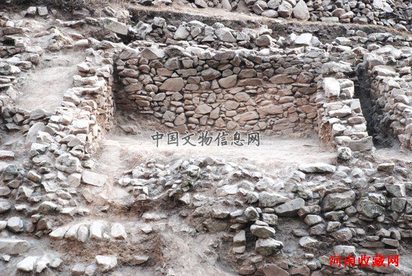 石墙可分为护坡墙、围墙及房屋残墙。护坡墙一般为单面垒砌,大多环绕山体沿等高线分布,从山腰到山顶有多道石墙分布,部分护坡墙互有交叉。遗址东南角护坡墙保存较好,呈三层台阶状递升至山顶,层层内收,每层高1米。遗址东部发现的外围石墙构筑规整,双层垒砌,宽度可达1.4米,石缝之间有坚硬的粘土粘接。该石墙中部拐角处垒砌有方形垒石加固。部分护坡墙保存高度可达1.7米。残缺石墙可能为残存房屋。遗址内发现有石沟一道,开口于④层下,长约6米,以较为光滑的圆石垒砌,沟宽45~60厘米、深35~40厘米,为遗址早期遗迹。