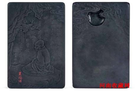 《研濡生香——砚、墨、印及文房诸器》专场为全年嘉德四季瓷杂拍卖中表现最为优异的专场,以端、歙诸石、澄泥等砚为主,搭配以墨、印以及文房诸器,以期为大家呈现一场颇具文人意蕴的文化盛宴。其中首推“清早期叶恭绰、尹润生旧藏王鸿绪、 吴荣光铭端石罗汉图砚”,本品为叶恭绰先生馈赠尹润生先生之物,得自尹先生后裔,来源清晰可靠。砚一侧落“荷屋吴荣光珍赏”款,另一侧琢铭文“丁巳年春三月浔与厯下。正甫珍玩”,背铭文“这个和尚唤作达摩,一语说不来,九年面壁坐,人道他是观世音化身, 我道他无事讨事做。録唐六如句。横云山人”,钤印“鸿绪”。砚石质滋润细腻,平板式,砚首深挖而成圆形墨池,周边配浅雕云纹,仿若月影朦胧,意境悠远。砚背琢岩下罗汉参禅图,山石嶙峋,罗汉衣褶,面部细节均交代细腻,为砚中佳品。