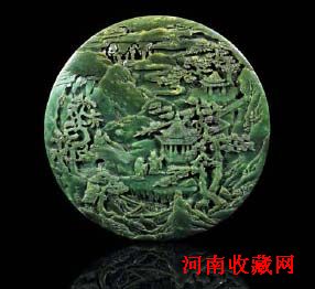 清乾隆 碧玉山水人物花鸟纹双面圆屏直径: 21.1 cm