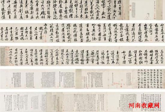 拍品介绍:黄庭坚《砥柱铭》,行书。该卷长达8.24米,抄录唐代魏征《砥柱铭》,全文82行407字。卷上有宋代贾似道、明代项元汴直至清代民国藏家的大量题跋和钤印。黄庭坚大字行书凝练有力,结构独特,是北宋书坛杰出的代表,与苏轼、米芾、蔡襄并称“宋四家”。