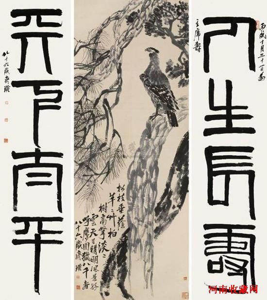 拍品介绍:齐白石代表作《松柏高立图·篆书四言联》,长266厘米,宽100厘米,为历年公私所见齐白石最大尺幅绘画及书法精品。图绘雄鹰傲然立于苍松之上。松鹰是齐白石最喜欢的画题之一,“鹰”寓意“英雄”,刚健有力,而“松柏”则有长寿之喻。所匹配的篆书“人生长寿,天下太平”对联,单幅纵264.5厘米,横65.8厘米,画面气势宏伟,与之匹配的篆书四言联,则浑厚自然、端庄大气,堪称齐白石书法精品。白石老人此画创作于1945年抗战胜利后,其时画家86岁,正是齐白石艺术创作的成熟期。作品表达了画家对国家民族和平发展的美好祈望,当时为蒋介石六十寿庆所作。2005年由美国旧金山私人释出后流入大陆,此番亮相受到藏家热烈关注。