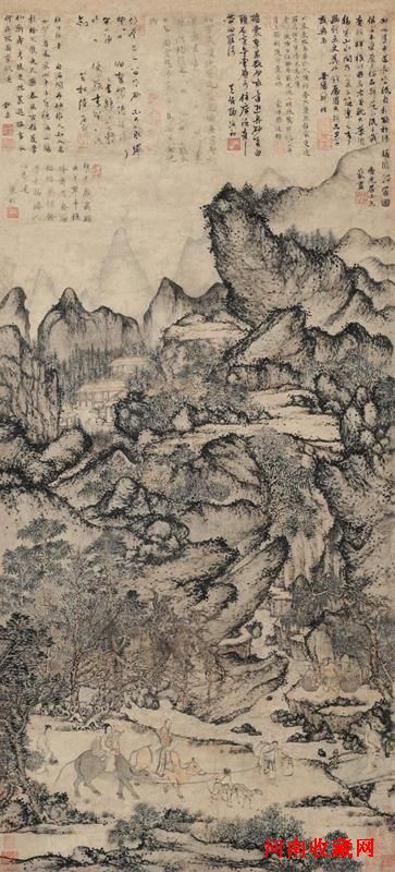 拍品介绍:《葛稚川移居图》是元代画家王蒙平生杰构,纸本设色立轴,纵139.5厘米、横58厘米,藏北京故宫博物院。《葛稚川移居图》描写晋人葛洪携子侄徙家于罗浮山炼丹的情景。画上有与王蒙同时或稍后的七位大学者的题诗,包括王冕的老师韩性、“元四家”倪瓒、陶复初、陈则等。该画曾为明代大收藏家项元汴珍藏,晚清入藏苏州过云楼顾氏家族。