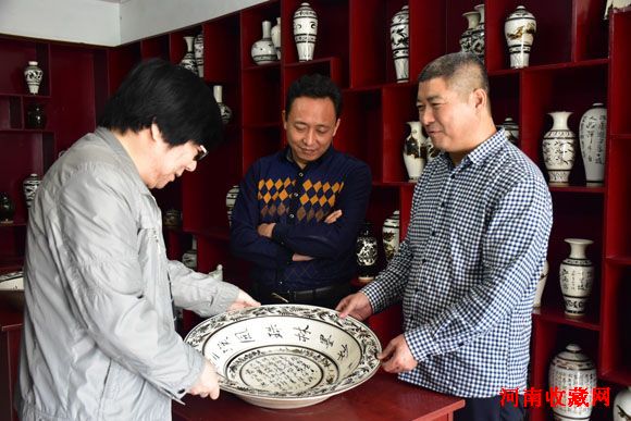席军晓向客人介绍席家窑坊复烧的白釉黑花大盘