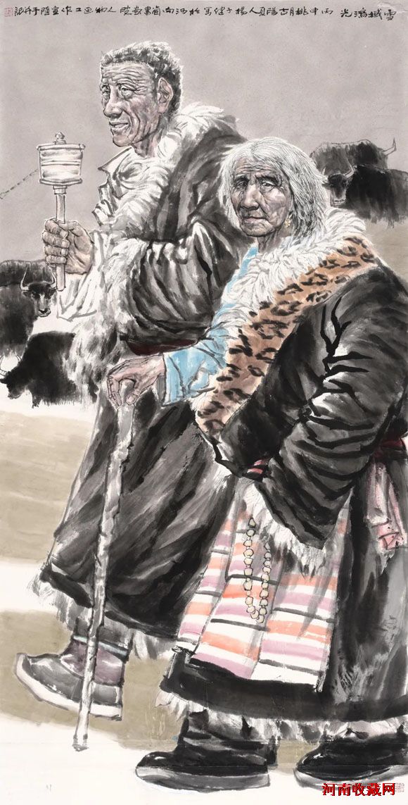 为此,他学画论,结识名家高师,在书画之途登攀不倦,在参加国家级大展要求的创作下大功夫,花大力气。吃苦受累、劳情伤神,在所不惜。为了扩展人物画题材,四处采风写生,多次赴西藏体验生活。雪域高原的风雪日月历练了他的笔情墨韵,京津繁荣的豪迈高卓升华了他的灵感妙悟,岭南诸城的日新月异澎湃了他热血激情,神州各地的山川人物不断提升着他创作中的艺术境界,这使他与那些专以商品画、应酬画为生的画工们不可同日而语。第五,他为人忠厚朴实,与人为善,助人为乐,重义轻财,包容性强。