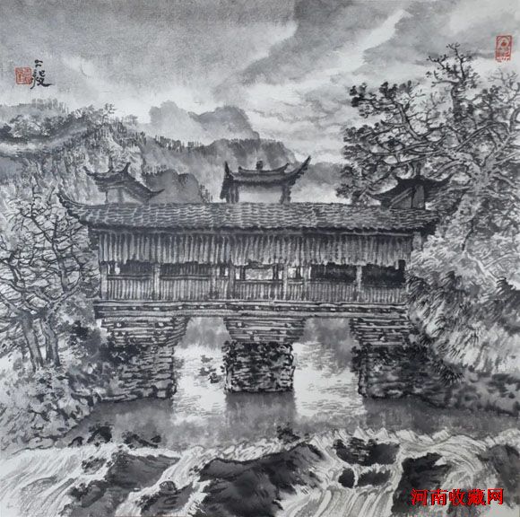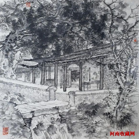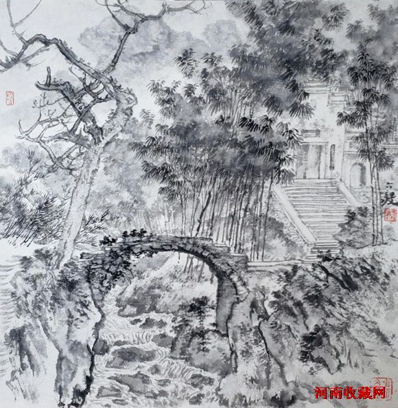 在古人山水中,很少画倒影,而图中近岸、树丛、枯枝、小桥之倒影是那样和谐、优美,毫无违和感,也是古为今用,洋为中用吧!