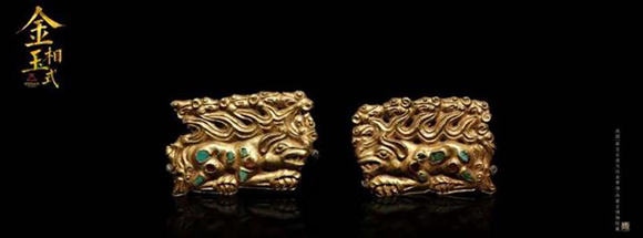 第一部分“金玉辉映”主要介绍金玉合器、嵌错玉石工艺。金玉组合使金铜的光芒毕现与玉石的莹质凝辉相映成趣,从铜与以绿松石为代表的广义玉石的组合,到黄金与以和田玉为主的真玉及宝石的组合,古人的审美经历了从神圣华贵之美到奢侈华丽之美的转变。