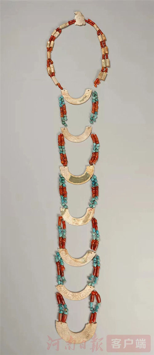 七璜组玉佩出土于三门峡虢国墓,墓主人为西周晚期虢国君主虢季。七璜组玉佩通长约126厘米,由七个由小到大依次递增的玉璜,间以左右对称双排两行的红玛瑙珠、料珠等串联而成,真可谓璀璨夺目,华丽无比。这件七璜组玉佩为虢国国君所有,出土时置于死者颈部至膝下,为研究西周的佩玉制度提供了实证。