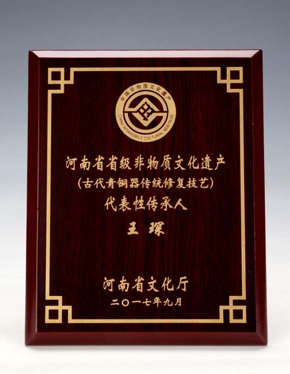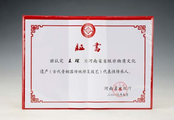2017年9月, 河南省文化厅认定王琛为河南省省级非物质文化遗产(古代青铜器传统修复技艺)代表性传承人。