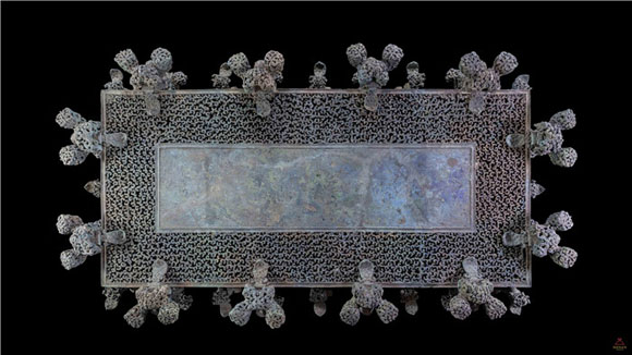 “就是个残破不堪的‘光板’铜案,长方形的;其中一个边儿上,还塌陷了大半拉子;整个案子,裂为七八块,就像经历了一场大地震一般,也像极了震后裂变的大地!”河南省文物考古研究所研究员赵世纲先生说,“没有现在的‘云纹’,前前后后、上下左右,都没有‘云纹’,哦,就像近几年流行起来的那些喝功夫茶的茶几,最普通的那种、没有什么装饰的那种!”