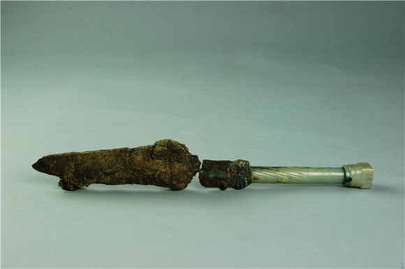 开始,考古学家们还不敢把这个铁家伙叫“剑”。“我们最初想,还是叫‘玉柄铁削’吧,或者‘玉柄铁匕首’!”王龙正先生说,“但铁削就是个削刀,一般单刃不说,还在生产工具的范畴内。而玉柄铁剑出土于兵器区,还是双刃的,叫‘削’,显然是有些不合适的。之后,大家倾向于叫它‘玉柄铁匕首’,毕竟它不长,才33厘米(因为折断,造成测量时取度不一,另一说是34.1厘米)。后来,大家觉得匕首不如剑好听威风,等到正式定名时,就把它命名为‘玉柄铁剑’了。”