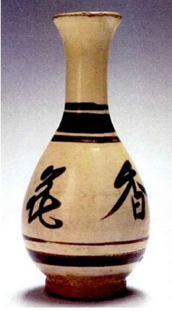 玉壶春瓶就宋代瓷瓶常见的造型,其基本造型为撇口,细颈、垂腹、圈足,线条柔和,如河南博物院收藏这件白釉玉壶春瓶(图10)宋辽金时期,玉壶瓶的釉色包括白釉、青釉、黑釉、白地黑花等不同种类。玉壶春在宋代后虽然作为酒瓶使用,但也有插花的功用,北宋曹组《临江仙》有“青琐窗深红兽暖,灯前共倒金尊。数枝梅浸玉壶春”可见玉壶春瓶也可作为花器使用。南宋类书《锦绣万花谷》中有诗云:“公余终日坐闲亭,看得梅开梅叶青。可是近来疏酒盏,酒瓶今已作花瓶。”苏辙的《戏题菊花》:“春初种菊助盘蔬,秋晚开花插酒壶。”可见饮酒之后,随手酒壶注水插花也是生活之中常事。洛杉矶亚洲博物馆收藏有一件白地黑花玉壶春瓶,瓶上书“香花奉神”四字,则说明了此瓶的功用为花器,且是作为佛前供花使用。(图11)