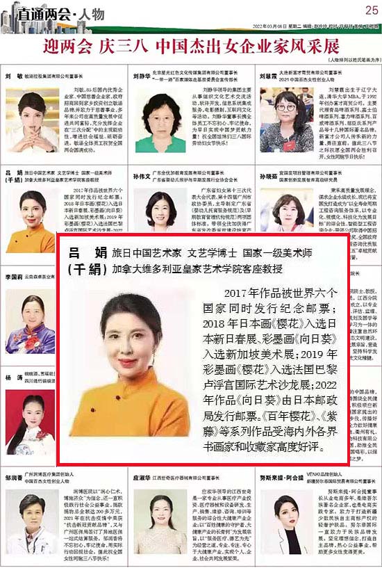 旅日画家吕娟再次成为“迎两会 庆三八 中国杰出女企业家风采展”重点推介名家