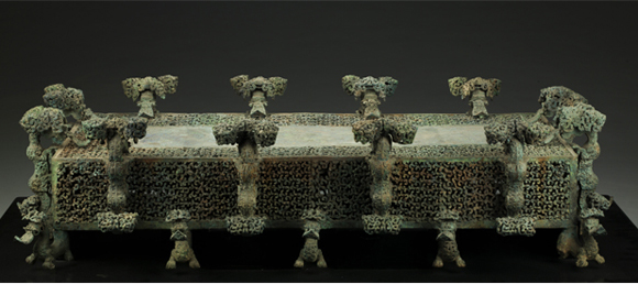 云纹铜禁,青铜器,春秋晚期,通高28.8厘米,器身长103厘米,宽46厘米,重量95.5千克。河南南阳淅川下寺春秋楚墓出土。现藏河南博物院。