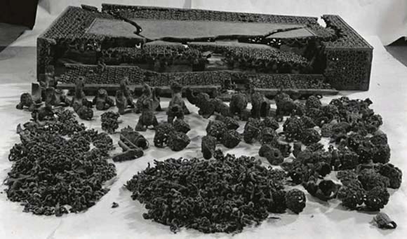 这件铜禁发掘出土时,禁体破裂成十余块,铜梗残断,云纹剥落,附兽、座兽全部从本体脱落并且大部分残缺不全,已成数百块碎片,铜梗和铜渣装了几个袋子(图1)。河南博物院高级技师王长青先生,带着他的几位徒弟,用了4年时间,通过拼接、矫形、粘接、翻模、补配、做旧处理等手段,最终将云纹铜禁完整修复,使铜禁恢复原貌。修复过程中,首先用较完整的兽体制作石膏模,用锡浇注成两个半兽,视兽体缺少什么,就从上面截取补配。头顶上的顶花以及尾部的尾花脱落及残断,几乎找不到完整的,用较大的残块翻模补配粘接。附兽及足兽的顶花、尾花几乎都是补配的。铜禁破碎到如此程度,让人惋惜,但是从另一方面讲,能够为近距离观察铜禁结构、研究铜禁铸造工艺提供便利条件。
