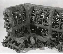 底座四角及禁下端承托铜禁的12个座兽的臀部上方有12个浇口,浇口处留有残柱。在禁侧底边每两个座兽的中间点有12个冒口痕迹。再根据禁面及禁体四周上有明显的分界线以及云纹重复出现的规律性,分辨出是由24块带云纹图案的蜡模和禁面中间一块平面蜡模共25块蜡摸组成。禁体没有合范缝隙,也没有铸接、焊接的痕迹,有的铜梗相互缠绕、弯曲,铜梗粗细以及交接处有手捏的痕迹,不规整。从现代铸造技术来看,云纹铜禁只能是失蜡法铸造而成,在5厘米的厚度空间中呈现这么复杂的结构,范铸法根本无法脱模。据此分析,禁体是将25块蜡模拼接在一起,边缘用蜡焊接,整体制范后将范翻转,采用失蜡法一次浇注而成。