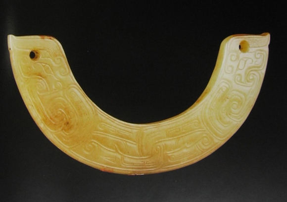 龙纹玉璜,玉璜,西周晚期,长9.7厘米、宽1.9厘米、厚0.6厘米,河南省三门峡市虢国墓地2009号墓出土。