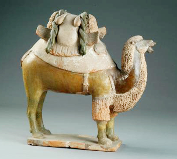 收藏在洛阳博物馆的这件绿釉载丝骆驼,创作于隋代至唐代早期之间,体长49.5cm,身高49.5cm,短颈高背,四足挺立,呈曲首嘶鸣状。骆驼前后颈和前肢上部有长毛,细尾左甩斜贴于臀部,下踏长方形底板。背上铺圆毯,两峰之间置一驮囊,驮囊两侧挂有扁壶和丝绢等物,下有垫板。驼身施黄绿釉,头顶、面部和颈部呈棕褐色,毛为灰黄色。其形态、做法和釉色具有早期三彩器的特征,是丝路交流繁盛的见证物,也预告着盛唐三彩的华丽绽放。(洛阳博物馆 曹向珂)