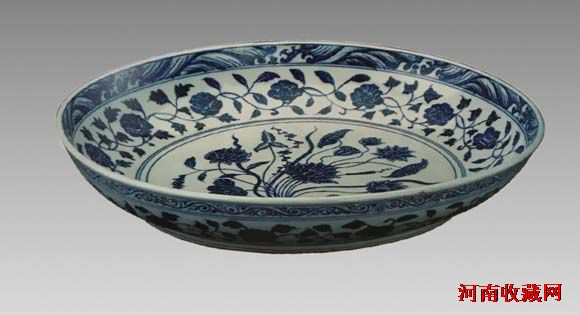 盘敞口,圆唇,弧腹内收,圈足。瓷盘内壁采用了三层纹饰的构图方法:口部边缘描绘的是青花波浪纹;腹部是由象征高洁的菊花和莲花、代表富贵的芍药和牡丹等七种花组成的缠枝花卉;内底中间是六朵形态各异的莲花所组成的“一束莲”图案,它们有的含苞欲放、娇艳欲滴,有的半开半闭、脉脉含情,整束莲花如烟似雾,好像正随着微风轻轻摆动,簇拥着正中一朵绽放的如意莲花,将中国文化的构图、意境和人文精神含蓄委婉地表达出来,共同构成了极具特色的民族风格,具有一种清高淡雅的韵味。(郑州博物馆藏)
