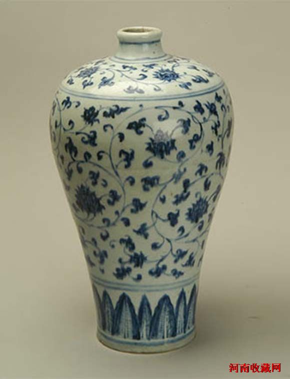 明代(公元1368——1644年),高35厘米,口径4.7厘米,郑州博物馆藏。小直口,束颈,丰肩,深腹,下腹内收,至足部稍外撇,造型敦厚雄健。瓶通体施白釉,略泛青色,肩腹部饰青花缠枝莲花纹,足饰蕉叶纹,纹饰疏密有致,釉色淡雅宜人。(郑州博物馆藏)