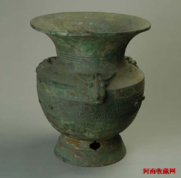 牛首饕餮纹铜尊商代(公元前1600——前1046年),高37厘米,口径32厘米,壁厚0.35厘米,重10.5公斤,1982年7月11日郑州向阳回族食品厂青铜器窖藏坑出土。大敞口,束颈,折肩,鼓腹,圜底,圈足,圈足上有三个"十"字形镂孔。尊颈部饰三周弦纹;肩部有三个牛首,眼目突起,具有较强的立体感;牛首间饰带状夔纹和联珠纹;腹部饰三组饕餮纹,线条严谨,纹饰精美,饕餮纹上下界以联珠纹,圈足上饰三周弦纹。(郑州博物馆藏)