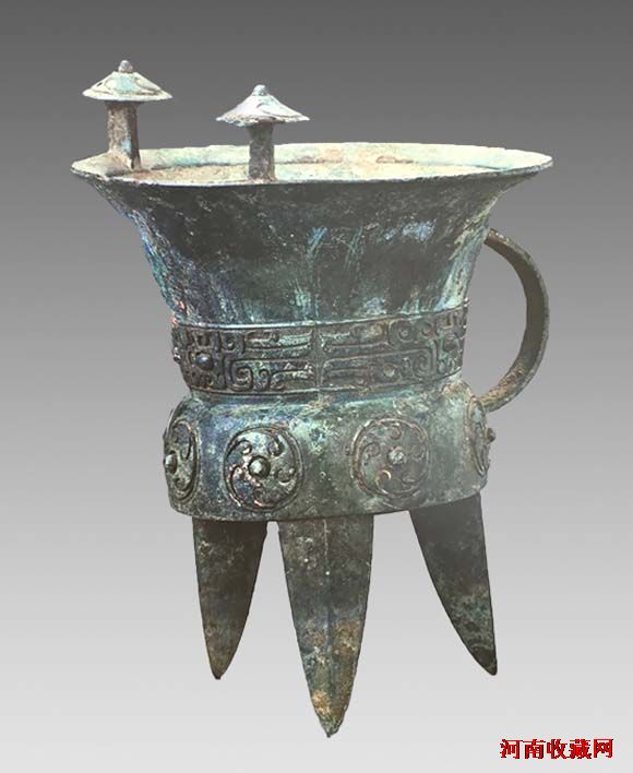 商代,旧藏,通高21.0厘米 口径17.5厘米,敞口, 尖唇,口沿处对称相立两个菌形柱,菌帽上饰涡纹; 颈口侈大,其下内弧敛收,颈腹分段明显,腹鼓外侈,其侧置有弧形鏊;平底,下承三个锥棱形空足。腰部饰一-周带状兽面纹, 腹饰七个涡纹。整器铸造精良,纹饰考究。(郑州博物馆藏)