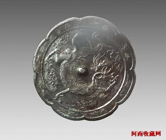 八出葵花形,内切圆形,圆钮。一龙盘曲,龙头面向镜钮作戏珠状,双角后翘,张口吐舌, 背鳍、腹甲、鳞片、刻画细密,前肢伸张,后肢曲伸,四肢露出三尖爪,身体矫健,神志轩昂。龙身四周环绕如意云头纹,线条飘逸。边缘八瓣内, 有长尾鸟、短尾鸟、 蜂蝶、蜻蜓分别飞向折枝花,花均为两叶两苞,设计精巧细致。郑州博物馆藏。