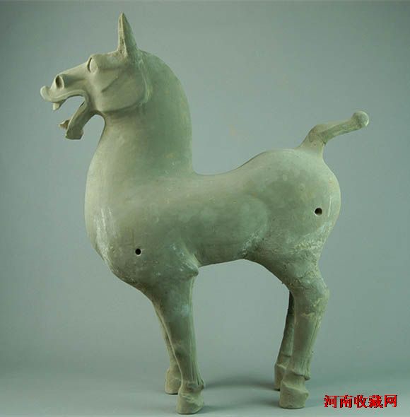 该灰陶马是南阳市博物馆于1978年7月在南阳市苏家大坑征集,高68,长66厘米,形体较大,与马同出土的还有一牵马俑。该马两耳直竖,鼓目前视,张口作嘶鸣状,前腿直立,后腿微曲,昂首翘尾。这匹陶马身体比例十分匀称,全身轮廓优美,肌肉富于弹性,骨骼和肌肤都有非常细腻的变化。马的头部雕刻细。头向上抬起,双目圆睁,鼻孔翕张,微微张开的嘴巴似乎正在发出嘶鸣。整体塑造得体态矫健,栩栩如生。马虽然处于静止状态,但却挺胸昂首,全身充满压抑不住的活力。是南阳汉代陶塑艺术的代表作品。
