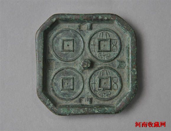 该钱范为青铜铸造,平面为倭角正方形,长、宽均为8.9厘米,厚1.2厘米。钱范周边有框,范内边沿处有子母榫,中间有平顶圆柱,上有钱模四枚,正背各二,左右对称扣合(面背同范),钱文为阳文正书“大泉五十”。钱范背面正中模糊可辨有阳文“大利当千”四字吉语。该范盒铜质精良,制作精细,是用来翻制泥质子范的母范。“大泉五十”钱币铸行于王莽居摄二年(公元7年)第一次币制变革时期,是王莽新朝货币中流通时间长、铸量的货币,铸行时间有13年。一枚“大泉五十”兑换五十枚“五铢”钱,100枚兑换黄金一斤。一枚“大泉五十”的重量只及汉五铢钱的两个半重,却要当五十个五铢钱用,这就意味着,新朝每发行一枚大钱,就要从百姓手中夺走四十七个半五铢钱财富。
