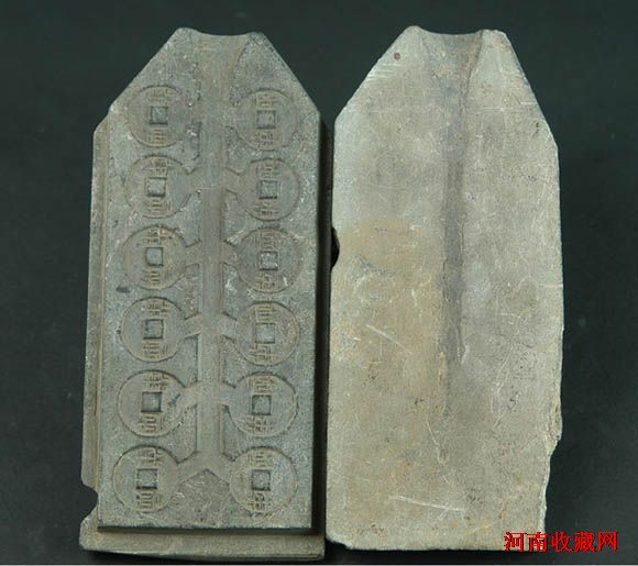 钱范为青灰色滑石质地,长方圭首形,由面范和背范两块组成。面范长23.8厘米,宽10.7厘米,厚1.9厘米。范面顶部正中有漏斗状浇口,与主浇道相连,浇口宽2.8厘米,主浇道宽1.1厘米,主浇道两侧有支流槽分别连接12个阴刻钱模。钱模直径2.9厘米,穿径0.9厘米,钱体较薄,属大穿小半两钱型。背面范长22.1厘米,宽10厘米,厚1.5厘米。上端亦有漏斗状浇口和主浇道,主浇道两边平而光滑。面范和背范相对在一起后,上端浇口吻合为完整的漏斗状圆孔。该范范形精致,“半两”二字为阴文小篆,文字工整隽秀,笔划均匀,字体全用方折,“半”字上下两横等齐,“两”字上横较短,内成双“人”字形,“人”字上画较长,有秦钱笔意,已隶化。长方圭首形钱范始见于秦末,西汉初仍继续使用,该范浇铸工艺为“直流分铸”式,铜液自主浇道流入后,直达范底,然后始分铸两侧钱模之中,主浇道宽大,支流斜出,全属西汉早期遗规,故该组半两石钱范当为汉初高后时期仿秦新铸之“八铢半两”钱范。
