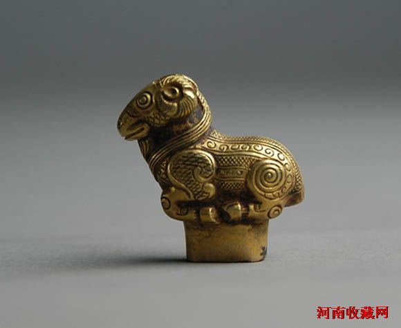 杖首,顾名思义,就是手杖顶端的饰物。杖首的装饰品种也很多,有龙首形、云龙形、羊形、马形、鹅形、鸠鸟形等,一般都雕刻精细生动,富有寓意。南阳博物馆收藏的这件杖首为羊形,黄金质地,长4.5厘米,宽2厘米,高4厘米。羊为静态卧姿,身体肥硕,短颈,昂首目视前方,眼睛以阴线刻成圆形,双角大而夸张,弯曲盘于头后方两侧。背部丰满,并饰勾云纹、谷纹等,前腿雕饰斜方格纹,后腿以大漩涡纹装饰,前足呈跪伏状,后足贴卧于腹下。腹下有一椭圆銎,用以套纳手杖。看着这只安详、乖巧的小绵羊,让人不觉顿生怜爱之心。