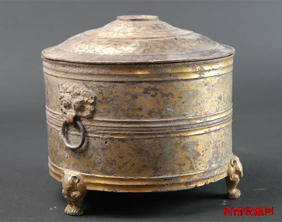 樽是一种古代的盛酒器,还用于温酒。见于战国,盛行于汉晋。 这件铜樽1933年4月出土于南阳县石桥镇汉墓。通体鎏金,盖面和腹外壁饰有两周精美的鎏金花纹。鎏金花纹带皆以自然的白铜为衬地,鎏金而成的图案为繁密而流畅的金色流云纹,珍禽瑞兽出没云气间,形象可辨者有应龙、羽人、鹿、朱雀、飞雁、独角兽等,纹饰流畅而有生气,雕刻精细。