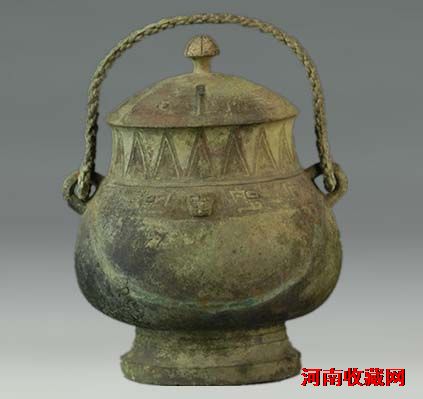 商代。 1979年信阳市罗山县莽张乡天湖村出土。 通高28厘米,直径14.5厘米。 造型端庄,束颈鼓腹,提梁为绳索状。从夔纹提梁卣中提取出1公斤左右、距今3000年的古酒,以最沉的酒列入吉尼斯世界纪录。 信阳博物馆·三厅·淮上诸侯·殷商之息。