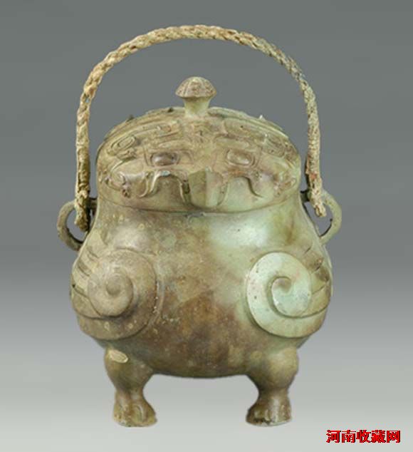 商代。 1987年信阳市罗山县莽张乡天湖村出土。 通高25厘米,通宽20厘米,腹径20--17.2厘米。 鸱鸮提梁卣是罗山县莽张乡商代墓葬中出土青铜器中的精品,其全身布满精 致的花纹,盖顶有一蘑菇状圆柱钮,盖上饰两组饕餮纹,鼻部凸出。卣的主题花纹为鸮两翼,腹饰卷尾和4只小鸟,器底有一龟纹,四足饰夔龙。 信阳博物馆·三厅·淮上诸侯·殷商之息。