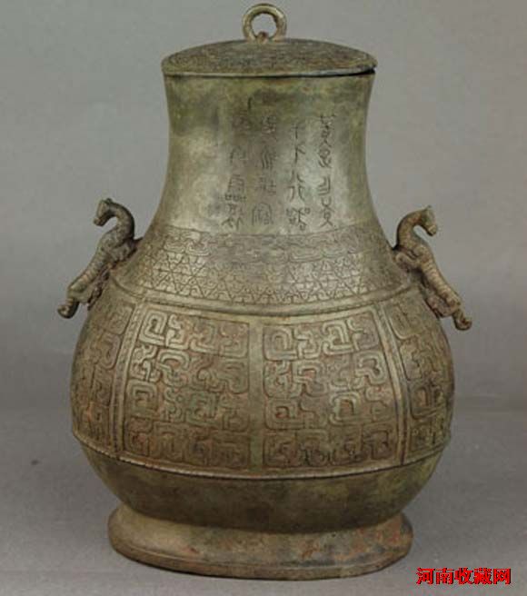 春秋。 1983年光山县宝相寺出土。 通高30.7厘米,口径10.3—12厘米,底径11.9—13.5厘米。长颈鼓腹,矮圈足,两耳作虎型。盖顶有一钮,盖面饰窃曲纹,腹部纹饰分三组,最上面是对环纹,中间是三角纹,下面是蟠虺纹。颈部铸有铭文四行十六字:“黄子作黄甫(夫)人器 则永宝宝霝冬(终)霝後”。黄夫人壶是春秋时期的盛酒器。孟姬是春秋黄国国君夫人,器身上的自铸铭文为我们研究其身份及信阳楚文化提供了实物资料。 信阳博物馆·三厅·淮上诸侯·故国春秋。
