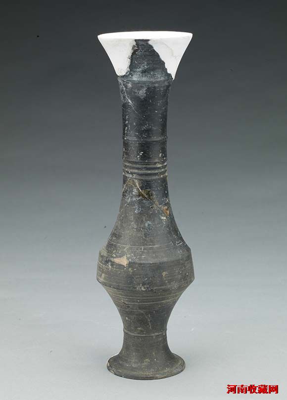 该器物为新石器时代龙山文化时期的酒器,出土于舞阳马村阿岗寺遗址,通高18、口径3.7、底径7厘米。敞口,束颈,折肩,下腹内收,平底,颈部饰三周竹节状弦纹,体态修长,通体亮黑,富于美感。由此可以看出原始社会晚期制陶工艺的发达和对酒礼的高度重视。现收藏于漯河市博物馆。