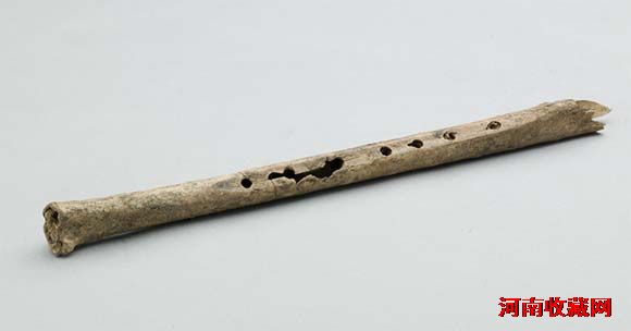 该器物为新石器时代贾湖遗址出土文物,该笛通体呈黄棕色,以鹤类尺骨制成,呈圆管形,其中一面磨制较平,依次排钻7个直径0.3厘米的圆孔,孔距分布不甚均匀。它是迄今为止中国发现时代最早、保存最为完整,出土个数最多,且能演奏的乐器实物。现收藏于漯河市博物馆。