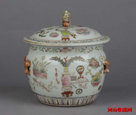 粉彩瓷盖罐 清代。1989年长葛市南席镇窖藏。高17.2、口径14.2 厘米。覆钵式盖,卧狮形钮,盖上饰盆花、棉花等。罐直口,深腹,平底。口沿下饰缠枝花,腹底部饰仰莲纹,腹部附四兽首系,绘盆花、案子、葫芦等纹饰。通体白釉绘粉彩