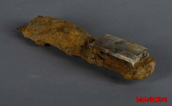 汉代。2003年7月,许昌市六一路弹簧厂工地出土。通长17.8、璏长5.9、宽2.4、厚1.3厘米。是附于剑鞘表面实用兼装饰的玉器。呈长方形,它顶面长条形薄片的一端向下稍翻卷,下面有长方形穿孔。顶面饰谷纹。土沁严重。