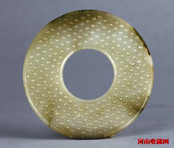 汉代。2011年征集购买。直径10.5、好径4.1、边厚0.6厘米。圆形,玉质白中闪青,边缘局部有褐色沁,璧正背均饰尾巴短小的谷纹。