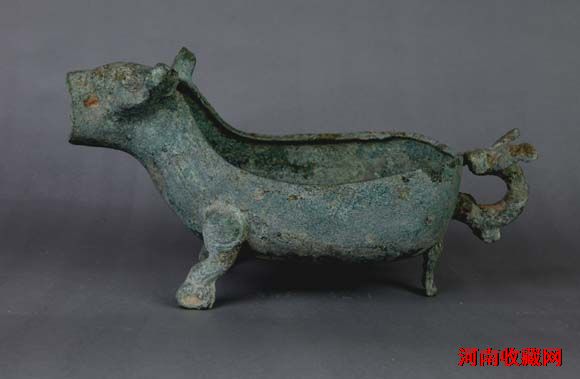 春秋。1992年许昌县(今建安区)公安局移交。高15、长30.3、宽14厘米。呈长椭圆形,前有兽首形流,后有兽形鋬,底承三足