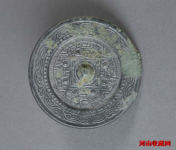 该镜呈圆形,半球形钮,圆钮座,座外有双线纹方格,栏角饰“三”字纹。主体纹饰图案简化,在规矩纹之旁只有一些点、划、圆珠,用以代表动物图案。主体纹饰外有一周射线纹,宽平缘上由内到外饰锯齿纹一周和弦纹两周。