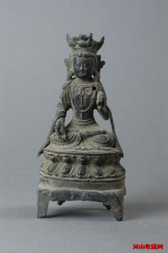 黄铜质,菩萨头戴花冠,双耳垂饰,颈下戴项圈,并有佩饰垂于胸前。身着帔巾,帔巾下垂上折搭于两肘,左手上曲持一物,右手做禅指状,置于右腿上,结跏趺坐于束腰仰覆莲底座上。