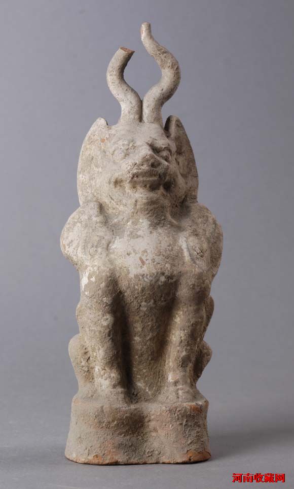 唐彩绘陶镇墓兽-3介绍唐彩绘陶镇墓兽唐代(618~907年)长11.5厘米,宽8.2厘米,高31.5厘米 1978年济源市坡头镇留庄村出土泥质灰白陶,模制。头顶有两角,张口,瞪眼,獠牙外露,面目狰狞,头两侧有两个招风大耳。此兽肌肉丰满,前腿直立,蹲坐在马蹄形底座上,通身施白彩绘。